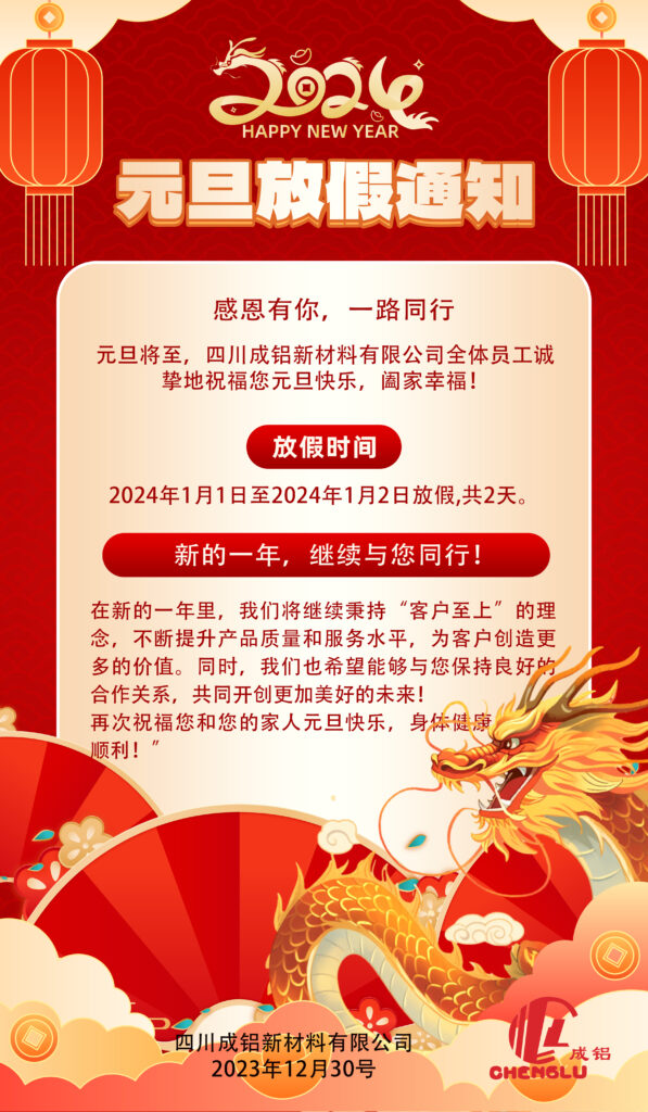 元旦將至,四川成鋁鋁業科技有限公司全體員工誠摯地祝福您元旦快樂,闔家幸福!